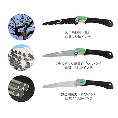 - 木工用替刃(黒):ブレードの材質は65Mn、山数:5山。適用範囲:生木の切断用、 仮枠作業から庭木の剪定まで活躍します。切断能力:生木70mm以内。