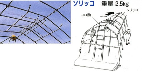 ●コロ助とソリッコの併用で、ハウス妻面からのフィルム張りが二人作業で簡単に行えます。
