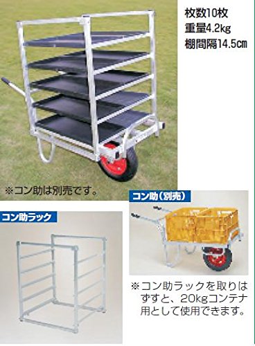 型式:NC-10 枚数:10枚 重量:4.2kg 棚間隔:14.5cm 《特長》 コン助専用育苗箱ラックです。
