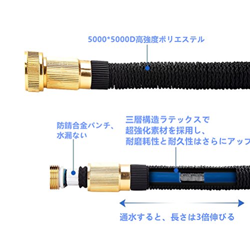 - ▶【伸縮性抜群】:ホースが通水後、7.5mから22.5mまで伸びることができます。内層はラテックスなので、寒さや高温を抵抗することができ、どんな天気も使用頂けます。伸縮性のほかに柔軟性もあり、折れることや絡まることはご心配なく、安心してご移動ください。