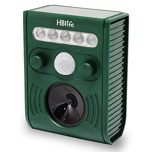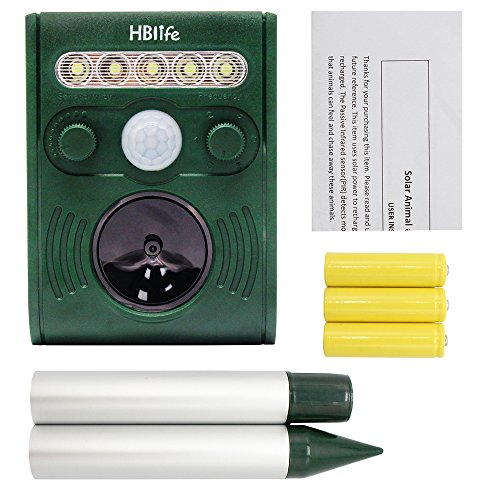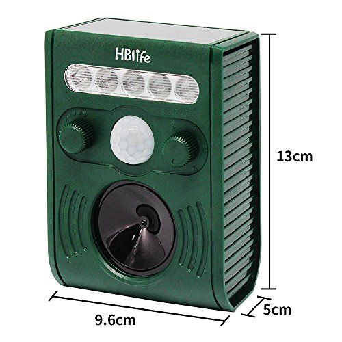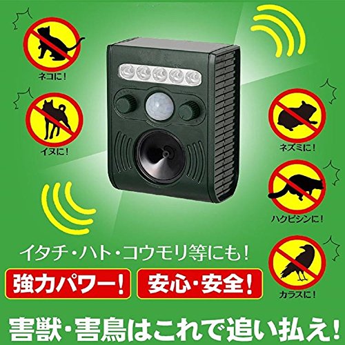- PIRセンサー方式:設定可能な周波数超音波とフラッシュライトで野生動物、猫、犬、ネズミ、キツネ、鳥、げっ歯類などと夜行性動物を傷つけずに追い払います。