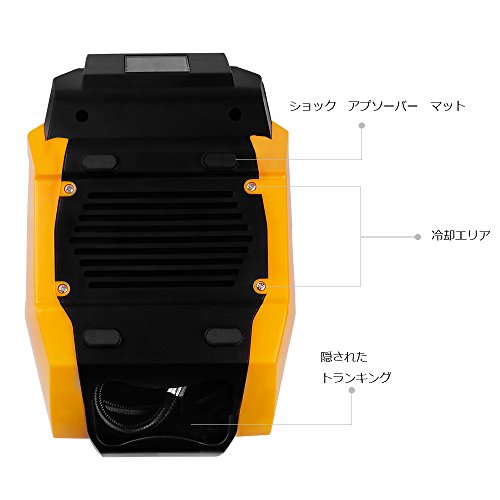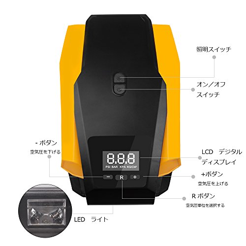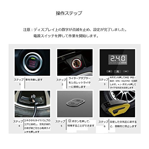 - ◆自動シャットダウン:適切な空気の技術を使用します。必要な圧力を設定して、「オン/オフ」ボタンを押すだけで、設定したタイヤ圧力に達する時、エアコンプレッサーを自動的に停止されます。エアコンプレッサーを監視する必要はなく、車内で仕事もできます。過度の膨張または低タイヤを避けます。