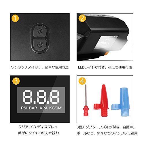 - ◆多機能:最大タイヤ圧力は150PSI、ほぼ全ての種類の自動車タイヤに適合します(注意:大型トラックや大型商用車用には適していません)。それはまた、バイク、オートバイやボールのための3つの異なるノズルアダプターが付属しています。