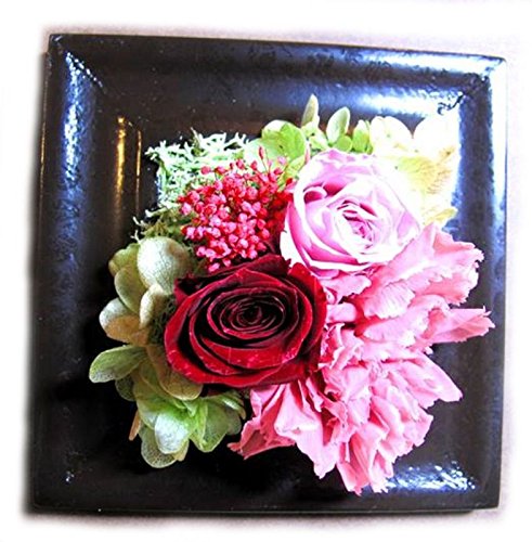 黒いフレーム花器にプリザーブドフラワーをアレンジメント。 ピンクカーネーション、赤とピンクのバラ、グリーンハイドランジア、そしてペッパーベリー。 ブラックフレームに良く色が映えてスタイリッシュなインテリア。 材質 プリザーブドフラワー、モス、紙、 他 サイズ H15×W13.5cm