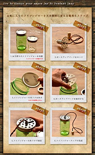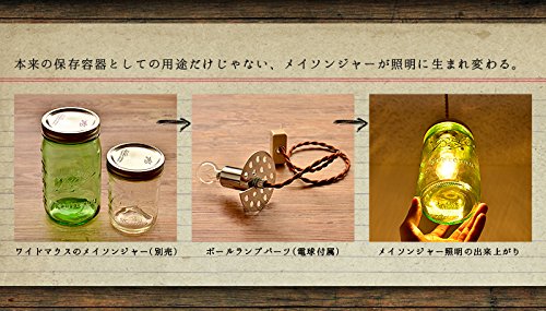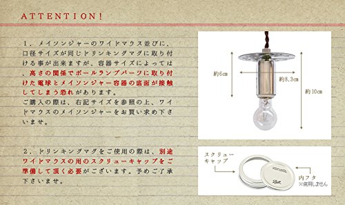 - 【ご注意】ワイドマウスのメイソンジャーは付属しません。 こちらはBall社製ではございません。 メイソンジャーのワイドマウス並びに、口径サイズが同じドリンキングマグに取り付ける事が出来ますが、容器サイズによっては、高さの関係でボールランプパーツに取り付けた電球とメイソンジャー容器の底面が接触してしまう恐れがあります。ご購入の際は、サイズをご参照の上お買い求め下さいませ。 ドリンキングマグをご使用の際は、別途ワイドマウス用のスクリューキャップをご準備して頂く必要がございます。予めご了承下さいませ。