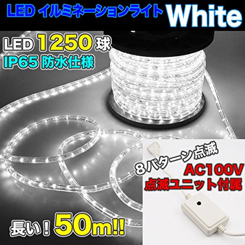 LEDロープライト 点滅ユニット 白 50m チューブライト 1250球 直径10mm イルミネーション 高輝度 AC100V クリスマス 照明 デコレーション 防水 屋外