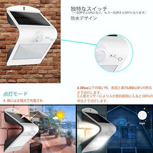 HONESTEAST ソーラーライト LED 人感センサーウォールライト ホワイト 防水 屋外照明 防犯 軒先 壁掛け 庭先 ガーデン 玄関周りなどのライト 夜間自動点灯ライト