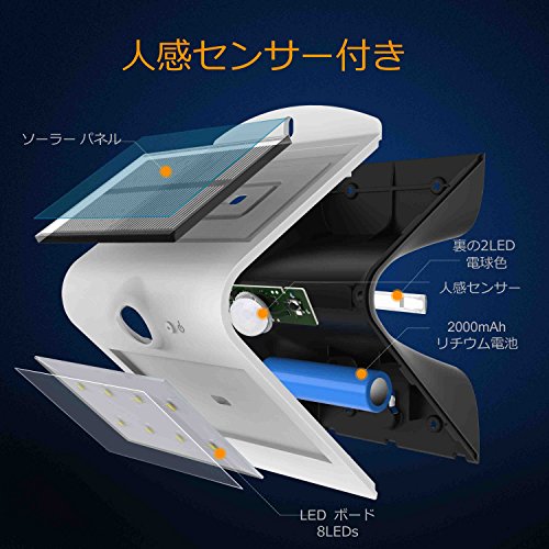 【商品仕様】 LEDのタイプ: SMD2835  ワット:0.3W 照射角:120° 探知範囲:2-6M 防水規格:IP65 色温度:暖白色:3000K +昼光色:6000K 電池 :3.7V/2000mA 充電時間:6H,稼働時間:12H 太陽光パネル: 0.8Wの単結晶シリコン サイズ:9.6x15.2x8.34cm 重さ:0.23kg パッケージ内容: ソーラー ライト+2ネジ+2ねじの殻+ピン+英語の説明書