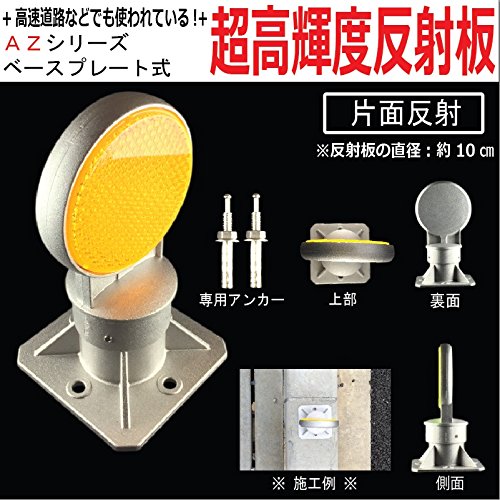 【超高輝度反射板 AZシリーズ】 視線誘導標 デリネーター 丸型直径100mm ベースプレート式 片面反射仕様 地面などへ簡単取付 (片面 黄)