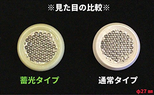 光を蓄えて暗くなると緑色に発光する蓄光機能をライトが当たると反射して光る反射機能の2つの機能を搭載した蓄光反射板! 蓄光反射板 シャイニングリフレクターRS 丸型直径44㎜ 反射部:クリア ベース部:蓄光グリーン発光 2017年、さらなる付加価値を機能を搭載し、生まれ変わったシャイニングリフレクターRSシリーズ。反射と蓄光が一体となり新登場です。 反射板の裏蓋が光を吸収し、暗いところで自ら光ります! ※反射板部分は自ら発光せずにライトが当たると反射して光ります※ ※蓄光タイプの裏蓋は素材の特性上、若干色がクリーム色に近いものとなります※ 本製品は通常のリフレクターとして、反射して光り、夜間など暗い場所では緑色に発光するので各種目印としてご使用頂けます。※蓄光機能を発揮するには光を蓄える必要があります。 使用している蓄光材は高輝度タイプの蓄光ABS樹脂を特別に配合して製造しております。 屋外でも使用可能な材料にしておりますので屋内外問わずに使用できます。 取付方法は往来品と同様、両面テープや接着剤で簡単に取り付けられます。 【各種サイズの比較】 【取付例】 【スペック】 品名 シャイニングリフレクターRS φ44 品番 R-44RS 色 クリア サイズ φ44×t=6.0 (mm) 材質 レンズ:メタクリル樹脂 土台部:蓄光ABS樹脂 製造国 日本