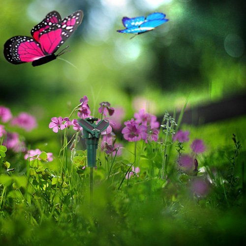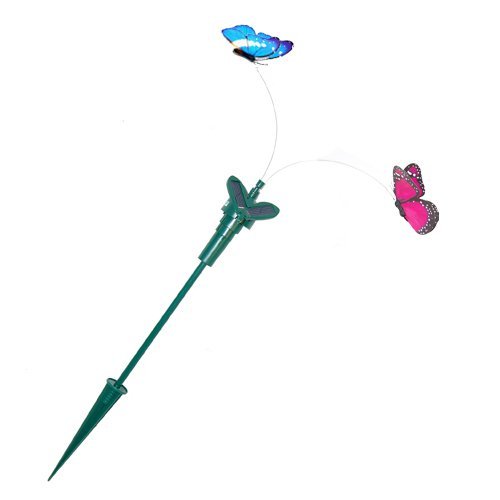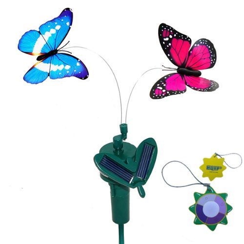 HQRPツインソーラーガーデン植物花/パティオ景観の装飾のためにフライングなびく蝶ピンクモナーク、ブルーモルフォパワード+ HQRP UVメーター