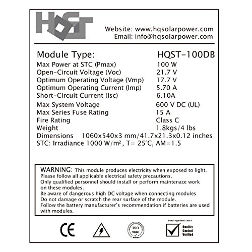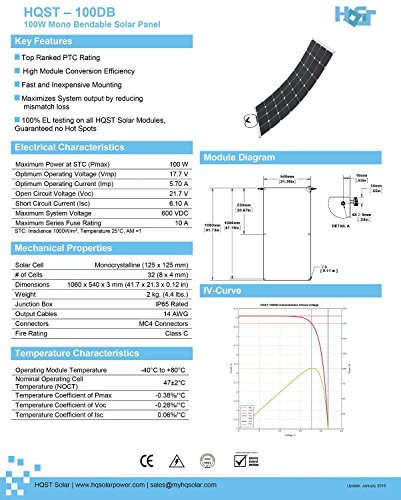 HQST 100W 12V単結晶軽量ソーラーパネルは、薄いプラスチックシートに積層されている先進的なサンパワー単結晶セルを採用しているから、伝統的なガラスより効率的、より耐久性を持っています。重量がわずか2.27kg、運搬、吊り下げ、取り外し、非常用などに最適です。また、表面にガラスが覆われ従来のパネルと違って、パネルが運転するとき、かすり傷を負われても、ガラスの粉砕や割れの危険性はありません。仕様書: