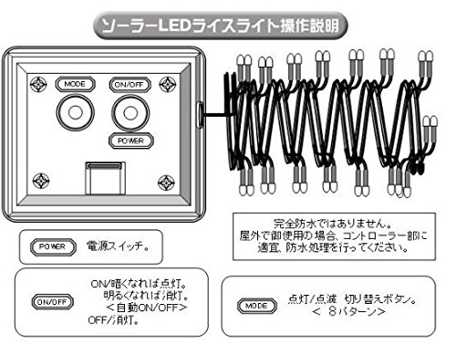- 点灯パターン:常時点灯、速さが異なる点滅、蛍のような明かりなど、全部で8パターン。