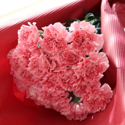 - 大輪ピンクのカーネーション20本を束ねた母の日定番の花束です。