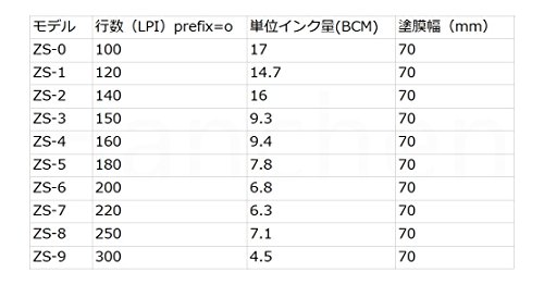 - 製品は、ステンレス鋼のアニロックスローラと耐溶剤性のゴムローラで構成され、アニロックスローラのライン数は100ラインから300ライン、印刷面の幅は70mmです。