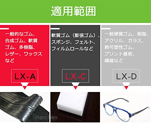 - 一般硬質ゴム、樹脂、アクリル、ガラス、熱可塑性ゴム、プリント基板、繊維などに適用します。