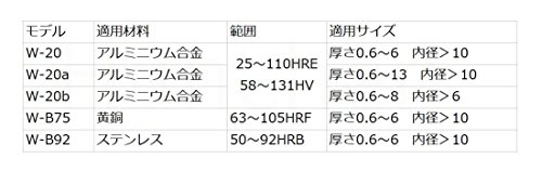 - W-20aはアルミニウム合金に適用、硬度範囲は25~110HRE 58~131HV、適用サイズ:厚さ0.6~13 内径>10