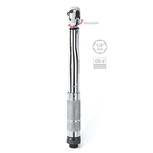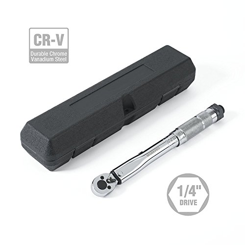 WORKPRO トルクレンチ 差込角 6.35mm 1/4インチ ブローケース付き • 「仕様」差込角 6.35mm 1/4インチ 商品重さ:570g 精度+-4% トルク設定範囲: 5-25N・m 専用ケース入り 本体材質:カーボンスチール 【用途】所定のトルクでのネジの締め付けの作業します。 「特徴」ベーシックなトルクレンチです。ルト、ナットの所定トルク値での正確な締め付け作業が可能です。 「使用上のご注意」・最大目盛以上、最小目盛以下のトルクでは使用しないでください。 ・斜め掛け・浅掛けしないよう、奥まで完全に差し込んで下さい。 ・パイプを継ぎ足したり、ハンマーなどで叩いたり、足で踏んで使用しないで下さい。 ・このトルクレンチは簡易型ですので、特に証明用等の精密な作業には向きません。 「安全上のご注意」・このトルクレンチはボルト、ナット、ネジ等を手動で締めることのみを目的に設定されています。本来の目的、用途以外での使用しないでください。 ・レンチの分解、改造、調整は絶対しないでください。 ・割れ 欠け 磨耗 変形等の異常が出た場合は、使用しないでください。 ・このトルクレンチは精密工具です。落下などの衝撃などが無いように、取り扱いには十分に注意してください。