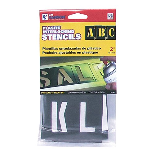 Reusable, interlocking and interchangeable. For use with paint, markers, and pencils. Includes 1 each A thru Z plus extra A, E, R, and S, numerals 0 9, dollar sign, ampersand (&), period, dash, and 2 spacers. No. 10192: 2"