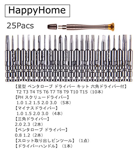 - 25セット内容:【星型 ペンタローブ ドライバー キット 六角ドライバー付】T2 T3 T4 T5 T6 T7 T8 T9 T10 T15(10本)【PH スクリュードライバー】1.0 1.2 1.5 2.0 3.0 (5本)【マイナスドライバー】1.0 1.5 2.0 3.0 (4本)【三角ドライバー】2.0 2.3(2本)【ペンタローブ ドライバー】 0.8 1.2(2本)【スロット取り出しピンツール】(1点)【ドライバーハンドル】(1本)