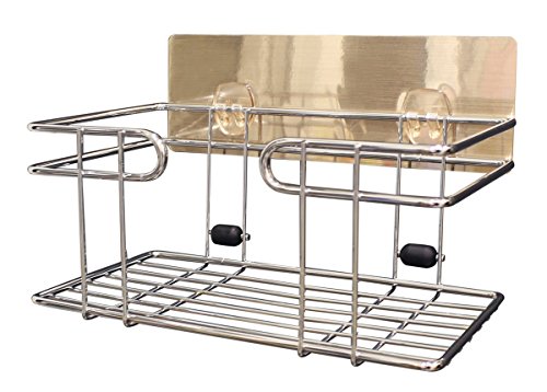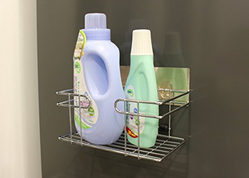 - Adhesive-mounted metal wire basket on wall to hold items at comfortable reach level. Declutter your laundry/shower area & make it more spacious by sticking directly on washer/dryer. Avoid having to bend over to grab detergent.