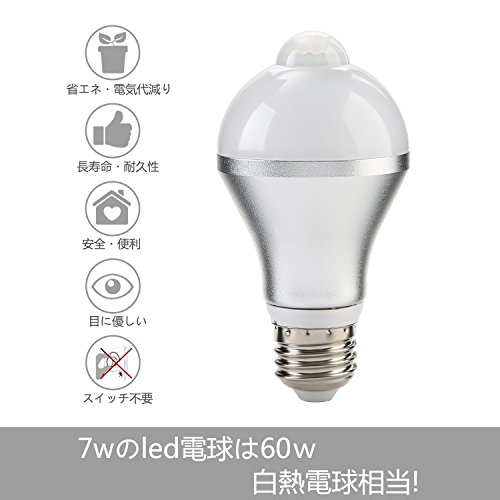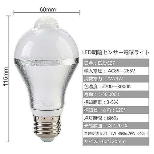 - 1.仕様:口金:E26/E27 輸入電圧: AC85—265V 消費電力:9W 色温度:2700—3000K 寿命: >50,000h 探知距離:3-5米 探知ビーム角:120° 点灯時間:約60s 光感範囲:≦8-12LUX 全光束(明るさ):750lm サイズ:60*120mm