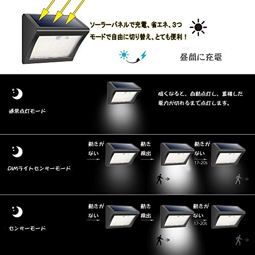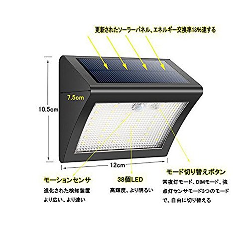 - 【38LED.高輝度】LEDライトを38個増加しますので、高輝度明るい、照明の範囲も広くなります。 太陽エネルギーから動力を供給します、エネルギーの変換率を18%に、最大輝度は約500ルーメンに達しました。夜間に照明機能があるだけではなく、防犯効果も役に立つ。