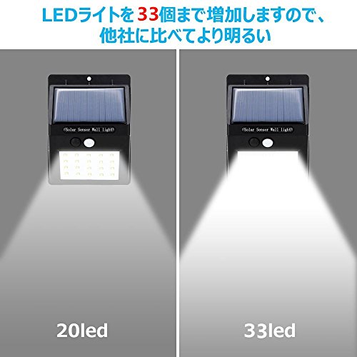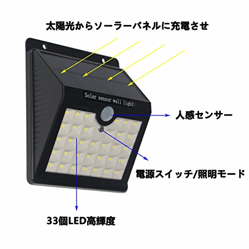 - [高輝度照明体験]優れた輝度:高輝度、低消費電力で33個のLED、明るさで十分です。 それは他の製品より明るく、照明の範囲もますます大きくなっています。 5Mの距離で120度範囲内に検出された場合,すぐ感知して自動的に点灯,美しい照明効果を提供します。大容量リチウム電池で太陽発電,エネルギーをソーラーパネルを受け電池に充電させ,完全に電気代は無料,連続12時間照明可能。