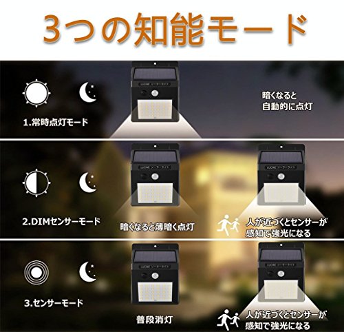 - 【3つの知能モード】①常時弱光モード(暗くなると、自動点灯しセンサー無し,80%の明るさで朝までを点灯。②DIMセンサーモード(暗くなるとライトは弱光点灯しますが、人が近づくとセンサー感知でライトが 明るくなり,高輝度で点灯します) ③人感センサーモード(普段は消灯しており,人の動きを検知すると,ライトが自動的に明るく点灯し,20秒後消灯になります)