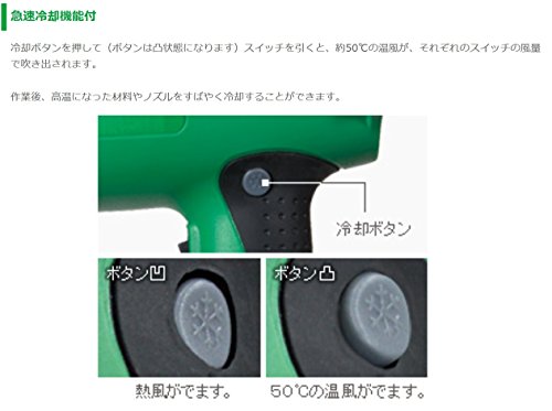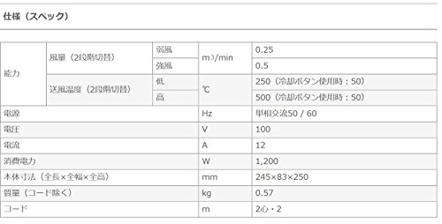 - 送風温度:250℃・500℃(2段階切替)・冷却ボタン使用時50℃