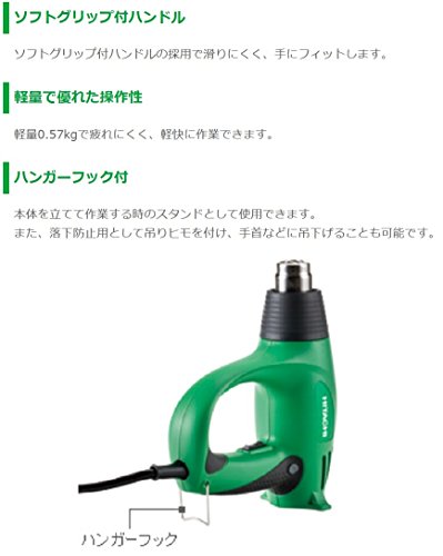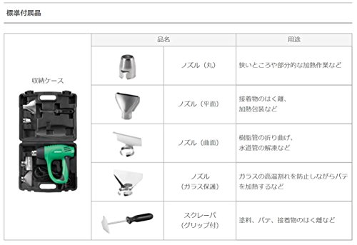 ●温度・風量2段切替により様々なシーンで活躍!●急速冷却機能付!●ソフトグリップ付ハンドル●軽量で優れた操作性●ハンガーフック付●能力●[風量]:0.25m3/min・0.5m3/min(2段階切替)●能力[送風温度]:250℃・500℃(2段階切替)・50℃(冷却ボタン使用時)電源:単相交流50/60Hz共用●電圧:100V●定格電流:12A消費電力:1200Wコード:2心・2m●寸法:[質量(コード除く)]:0.57kg・[機体寸法]長さ245×高さ250×幅83mm●標準付属品:ノズル(丸)・ノズル(平面)・ノズル(曲面)・ノズル(ガラス保護)・スクレーバ(グリップ付)・収納ケース●用途:●塩ビ板曲げ加工●加熱包装●シールはがし●樹脂管の曲げ加工●熱収縮チューブの加工●塗装はがし●窓枠パテのはく離●水道管の解凍など