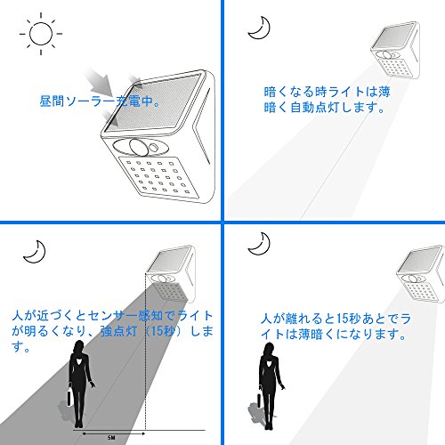 - ソーラー充電:自然の力でエコ充電するLEDセンサーライトです。(人感センサーが反応しない限り点灯はしません)電気代は永久にゼロ。環境にやさしい商品です。