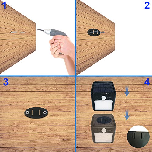 製品を使う前に、ロック針でスイッチ穴を軽く指すと、太陽エネルギー使用モードが起動されます。 2、取り付ける方法: 提供されるヒンジ、ネジで壁や、柱にライトを取り付けます。 お勧め高度:2~4メードル ソーラーパネル:高効率な大型パネルは、一晩中の動作に充分なバッテリー充電を可能にする。 ON/OFFスイッチ:ONにするとセンサーが感知モードに入る。 PIRモーションセンサー:人の動き、周囲の明るさを検知するセンサー。 LEDパネルライト:16個のLEDが設置され大変明るいパネル。