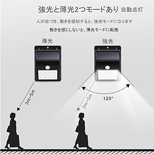 - 自動点灯:このライトは3メートル以内に動きを感知した際に作動するPIRモーションセンサーを搭載しています。10秒のライト点灯の間にさらなる動作が感知されなく動きがない場合には自動的に薄暗い明かりが点灯します
