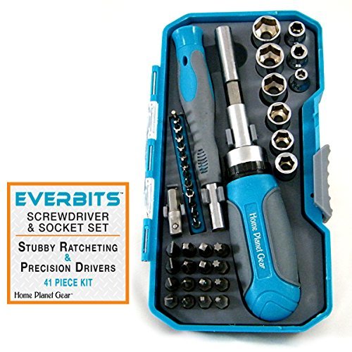 EverBits Screwdriver Set - Precision & Stubby Ratcheting with Sockets and Case. Bits: Torx, Hex, Phillips, Flat, Star, Square. Best for Home Repair, Electronics, Hobby Tool Kit. by Home Planet Gear