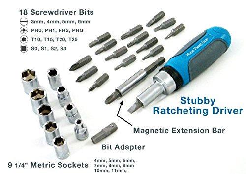 - PRECISION driver has free-spinning butt to allow constant pressure when turning handle. RATCHETING STUBBY driver has 3 settings: fixed, forward, reverse; plus adapter & magnetized extender.
