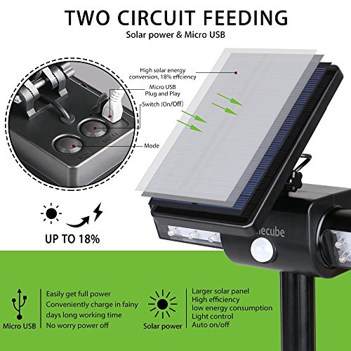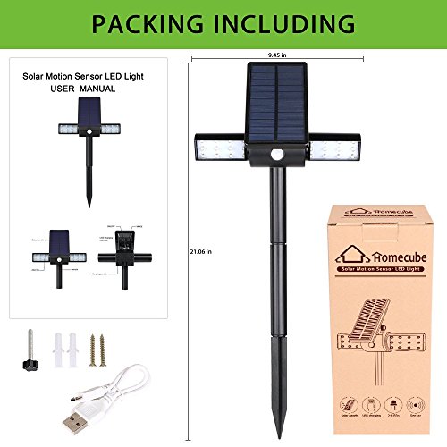 NOTE:Make sure the solar panel face to the sun,it suggested to set the light on and fully charged before first use, the best way to use USB cable to charge the light for 6 hrs.6 Month Warranty by Homecube.. Homecube 24 LED Solar Lights with 360° Rotatable Dual Head uses the latest solar charging technology as well and is designed with USB charging port for both outdoor and indoor use. Rugged and durable; waterproof and heatproof.