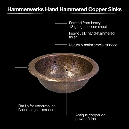 Overflow Assembly included. The Houzer HW-BAB1RS Hammerwerks Copper Baby Round Lavatory Sink is a petite round lavatory bowl with the most beautiful hammer finish. This lavatory sinks eXude warmth and elegance whether in the powder room or main bath. Formed from heavy copper sheet, it is made to last for generations and deserves the medal of honor for their glorious color and rich feel. The sinks of Hammerwerks copper collection are individually hand-hammered and its surfaces are hygienic and do not support bacteria like many other materials. This model features Antique copper finish, self-rimming for topmount installation, 1.5 inch drain opening. Bowl measure 9.5 inch diameter by 4.5 inch deep and supplied with overflow assembly and covered by limited lifetime warranty. For over three decades, Houzer has been improving millions of kitchens across America and overseas, one sink at a time. Houzer offers over 100 sensational models in Stainless steel, Quartz Granite, Fireclay, Porcelain Enamel steel, and Copper to match any design from traditional to contemporary. Houzer believes that sinks can make your life in the kitchen easier and more enjoyable.