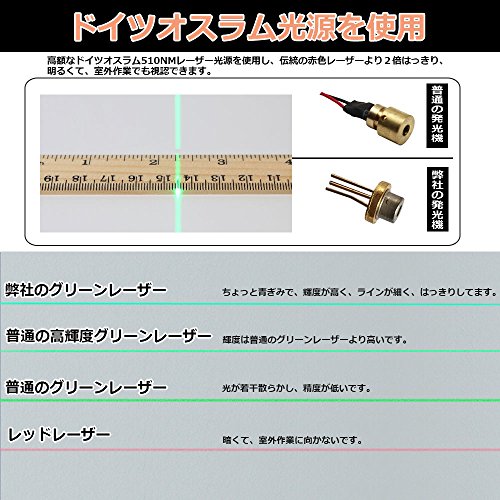 - 【視認性の良いグリーンレーザーを採用】赤色よりも視覚的に見やすいとされる緑色のレーザーを採用しています。ジンバル方式を採用し、自然の原理で制御しているので、温度変化に強く、安定性が高い仕様です。