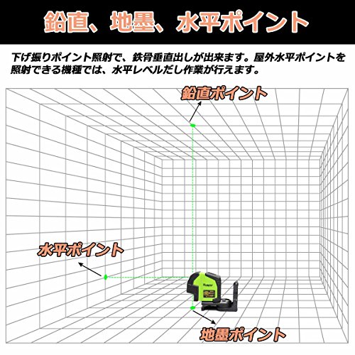 - 【3ポイント照射するタイプ】屋外水平ポイント&鉛直ポイント&地墨の3ポイントを照射するグリーンレーザーで、アンカー・ダクトなどの位置決めに適用されます。また屋外水平ポイントを照射できる機種で、水平レベルだし作業が行えます。サッシの水平出しや、レンガ・ブロックの積み上げ作業にも活躍します。