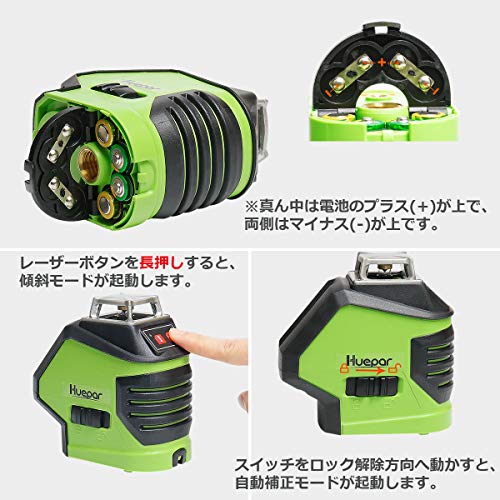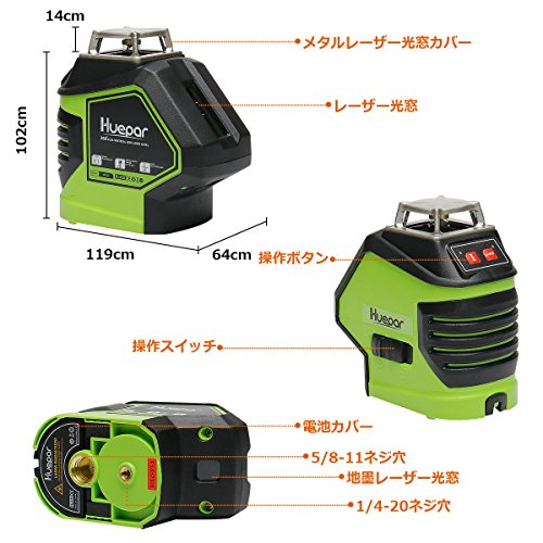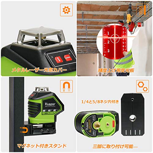 Huepar 5ライン レーザー墨出し器 レッド レーザー 赤色 クロスラインレーザー 自動補正機能 高輝度 高精度 ライン出射角360°4方向大矩照射モデル 地墨 鉛直ポイント 5ライン+2ポイントタイプ 621CR