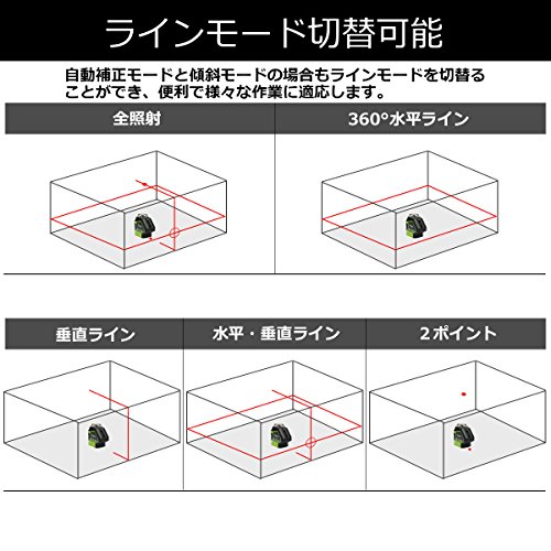 - 【品質の良い赤色レーザーを採用】明るい現場でもラインが良く見える品質のよい赤色レーザーを採用し、普通の赤色レーザーより明るくて、はっきりしています。それに本機種のレーザー照射は水平垂直地墨の組み合わせで5段階の切り替えに対応し、便利で様々な作業に適応します。