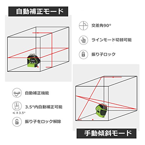 - 【自動補正モードと手動傾斜モード】ジンバル方式を採用し、水平垂直ラインが照射できるほか、振り子のロックが可能なので、傾斜ライン照射もでき、階段手すりの施工や配管施工など便利です。重力を活用し、自然の原理で制御しているので、温度変化に強く、安定性が高い仕様です。