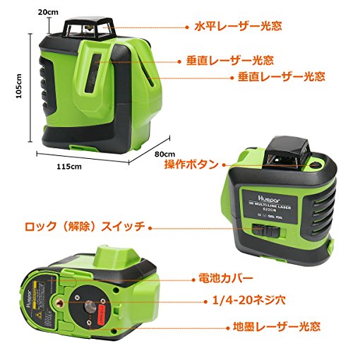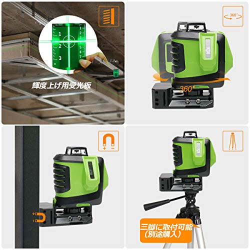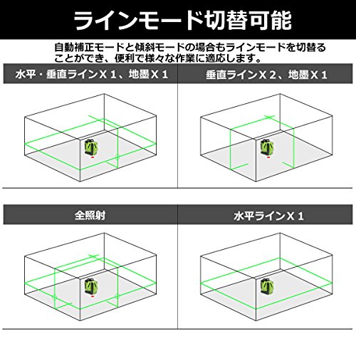 - 【視認性の良いグリーンレーザーを採用】赤色よりも視覚的に見やすいとされる緑色のレーザーを採用していて、伝統の赤色レーザーより2倍明るくて、はっきりしています。それに本機種のレーザー照射は水平垂直地墨の組み合わせで4段階の切り替えに対応し、便利で様々な作業に適応します。