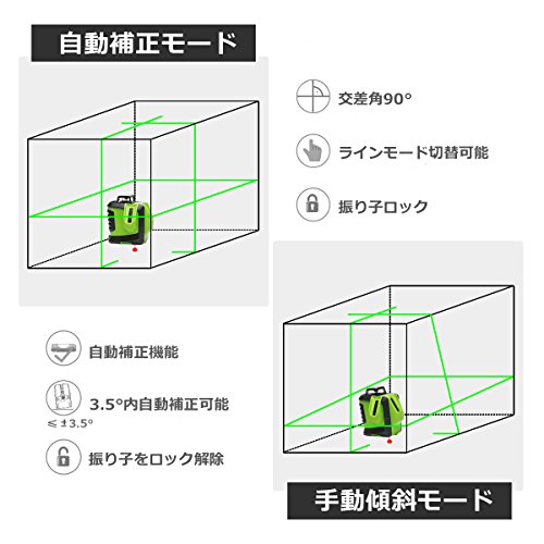 - 【自動補正モードと手動傾斜モード】ジンバル方式を採用し、水平垂直ラインが照射できるほか、振り子のロックが可能なので、傾斜ライン照射もでき、階段手すりの施工や配管施工など便利です。重力を活用し、自然の原理で制御しているので、温度変化に強く、安定性が高い仕様です。