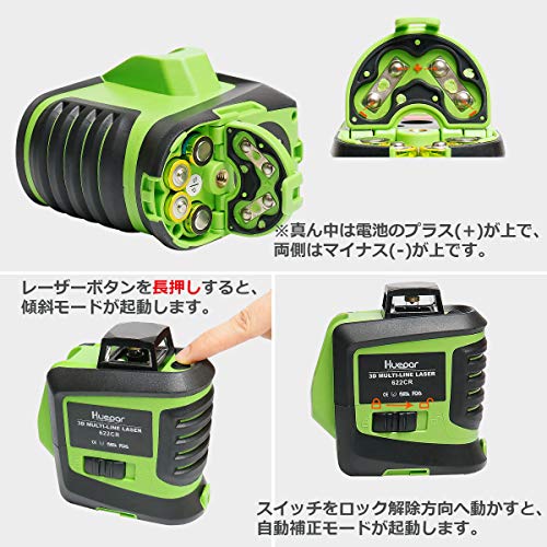 Huepar グリーン レーザー墨出し器 緑色 レーザー クロスラインレーザー 自動補正機能 高輝度 高精度 ライン出射角360°4方向大矩照射モデル 地墨 鉛直ポイント 6ライン+地墨タイプ 622CG