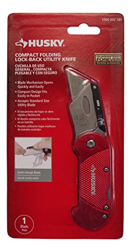 (1) Utility Knife Blade Included. The Husky Compact Folding Lock-Back Utility Knife features a compact design and a quick-change blade mechanism that accepts standard size utility blades. The lock-back design locks the blade in place for safe and efficient cutting while the compact size, convenient folding design and lightweight aluminum handle with clip makes it easy for a user to safely store the knife in their pocket. This knife is great for use at home, on the job or outdoors.