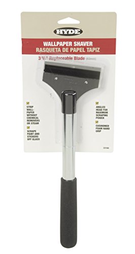 Cushioned foam hand grip. HYDE TOOLS WALLPAPER SHAVERSShaves off wallpaper, scrapes paint or stickers from glass. Die-cast head holds replaceable blade at angle. Tubular-metal handle/cushioned foam grip. Use 3-1/4 No. 33150 blades. 11 O.A. Length - Carded Blade Wdth. In.=3-1/4