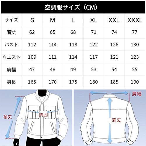- 空調服サイズ:M・L・XL・XXL(具体的なサイズは左側にあります。)
