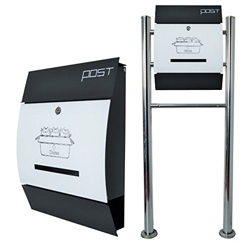 お洒落なモダンデザイン郵便ポスト 【サイズ】(ポスト最大部)巾350x高さ445x奥行95mm 【投函口】約330x35mm (スタンド)巾500x高さ1200mm ポスト下のバー1本には、好みでプランターやプレートを取り付けてオリジナリティのある玄関に。 【付属品】高級キーホルダー1個、カギ2本、アンカープラグ4本、ネジ4本、ゴム栓4個、組立済スタンドセット1式 【重量】1セット約8kg 【素材】(ポスト本体)めっき鋼板 (スタンド)プレミアムステンレス 【仕上げ】(ポスト 本体)ブラック 黒色;(フロントパネル)猫柄 (スタンドカラー)シルバーステンレス色 【仕様】スタンドタイプ、A4サイズ、前いれ、前だし、大容量♪ 【特徴】 カギ付き★安心♪カギなしでもご使用可能★便利♪ 洗練デザイン★錆びにくい加工♪ シンプル・取り付け簡単♪マグネット式・使い勝手抜群♪ 大きいサイズ★厚い通販カタログ数冊も入る大容量♪ 【製造メーカー情報】:本場ヨーロッパモダンデザイン郵便ポスト専門製造工場。 【ご注意】 鍵が共通しないので、紛失しないでください♪